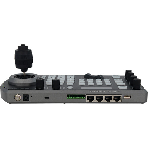 Este controlador destaca por su diseño intuitivo y su excelente ergonomía: un joystick profesional de 3 ejes, perillas dedicadas para ajustes rápidos y botones iluminados que facilitan la operación incluso en entornos con poca luz. Además, puede manejar hasta 255 cámaras por IP y 14 cámaras por VISCA, lo que lo convierte en una solución escalable para instalaciones grandes.
