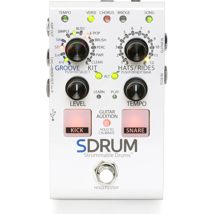 Crea ritmos realistas al instante con el DigiTech SDRUM. Genera patrones de batería tocando tu guitarra o bajo, con kits profesionales, metrónomo integrado y sincronización JamSync.