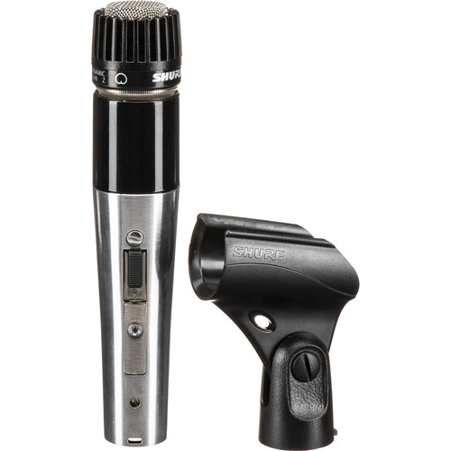 Micrófono dinámico cardioide para voz e instrumentos, con doble impedancia seleccionable, interruptor magnético silencioso e incluye clip para montaje.