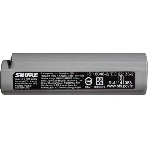 Shure SB904, batería Li-Ion recargable de 2420mAh para transmisores GLX-D+ bodypack y de mano. Ligera, eficiente y recargable vía USB-C o receptor GLXD4+.