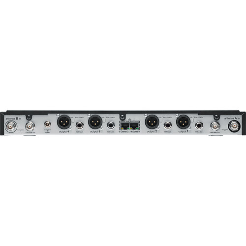 El receptor incluye pantalla LCD de alto contraste, ajuste de ganancia hasta 60 dB, salidas XLR y 1/4” por canal, y función de audio summing, que permite combinar salidas (4, 3, 2 o 1) según necesidades. Además, con RF cascading puedes conectar dos receptores y crear un sistema de 8 canales en solo 2 espacios de rack.