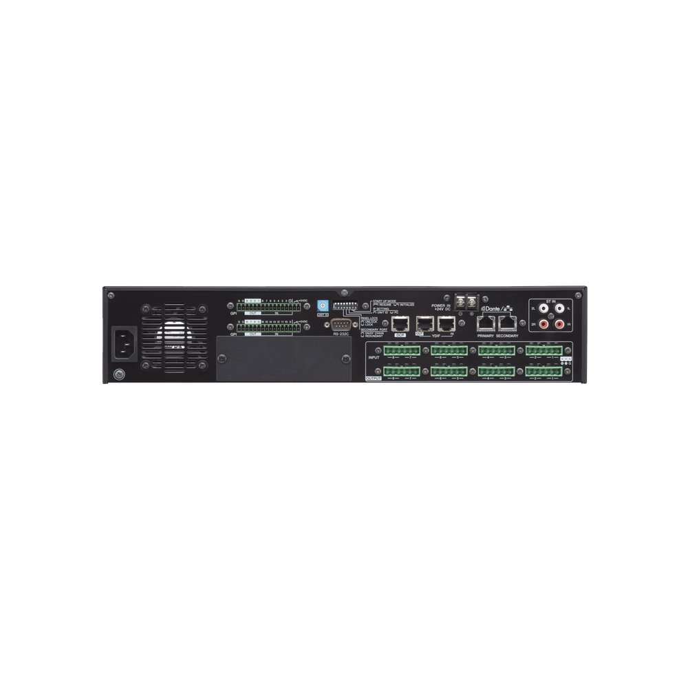 Ofrece 8 entradas mic/line y 8 salidas analógicas, junto con 16 canales YDIF y 16 canales Dante para transmisión de audio digital en red. Incluye también ranura Mini-YGDAI para ampliar la conectividad con módulos adicionales (analógicos o digitales), dos entradas RCA estéreo y una ranura SD para reproducción de archivos MP3/WAV.